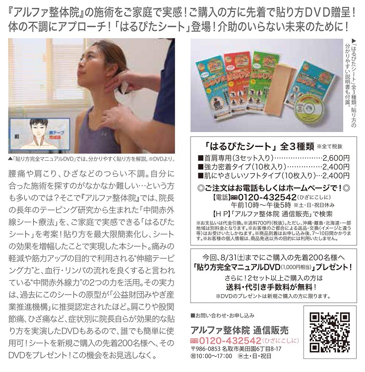 風邪などで調子が悪い時や天気が悪い時、体の一部が針で刺したみたいにチクチクと痛むように。さまざまな療法を試したが改善せず、20代から40年もの間悩まされてきました。今年になって「肋間神経痛」と診断され、知人の紹介で『アルファ整体院』へ。今まで試してきた施術とは全く異なり、「アイシング」とテープによる施術を受けました。「はるぴたシート」は、通院時に貼り替えてもらっていましたが、日常的に利用したいと思い自分でも購入。続けるうちに痛みが徐々に改善!試しに肘にも貼ってみたら、何をやっても変わらなかった肘の痛みも楽になりました。悩んでいる人は、早めに見てもらった方が良いと思います。 |