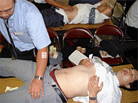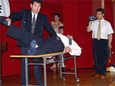 昨年の講習会は上肢を中心に行ったので、今年は腰や股・膝関節、大腿・下腿等の下肢部を中心に行われ、モデルを使ってテーピングをし、その模様をビデオに撮りプロジェクターで投影し、細かい動きまで大画面で確認しながらのセミナーでした。 |